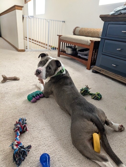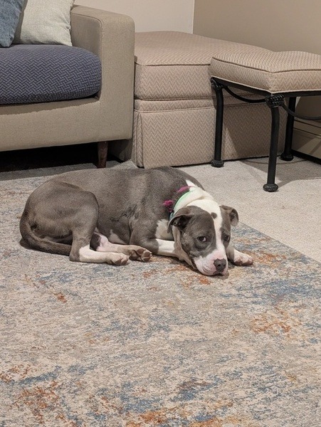 Energy level: Low to Medium. She has recently learned what a couch is and has embraced the couch potato lifestyle. She can also summon plenty of energy to play with friends, but tires quickly and is ready to relax again! She enjoys shorter, slower, sniffy walks. She is building up her strength and will likely be more energetic in the future. Bae Bae is also learning about toys and really loves hard chewy toys.