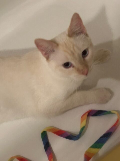 Animal Characteristics: Kingston is a shy, sweet, growing, tender-hearted kitten who is blossoming into an affectionate, cuddly, playful boy. He will appreciate a peaceful, gradual introduction to his forever home and new people. Slow blinks are his love language, and if you purr, trill and meow, he’ll be adorably chatty with you! He warms up if you give him a safe cave bed or hiding spot, yummy food and lots of wand playtime. Kingston enjoys poultry-based kibble and can likely expand his menu as his tummy heals from whatever he ate outdoors as a tiny, abandoned kitten. He loves companionship, playtime and pets all over his body, especially scratches around his ears. He will flop over and show you his tummy while making biscuits! He is getting used to being gently held and picked up. Kingston will appreciate a loving, patient adopter who is home more often than not and a stable schedule of affection and attention!