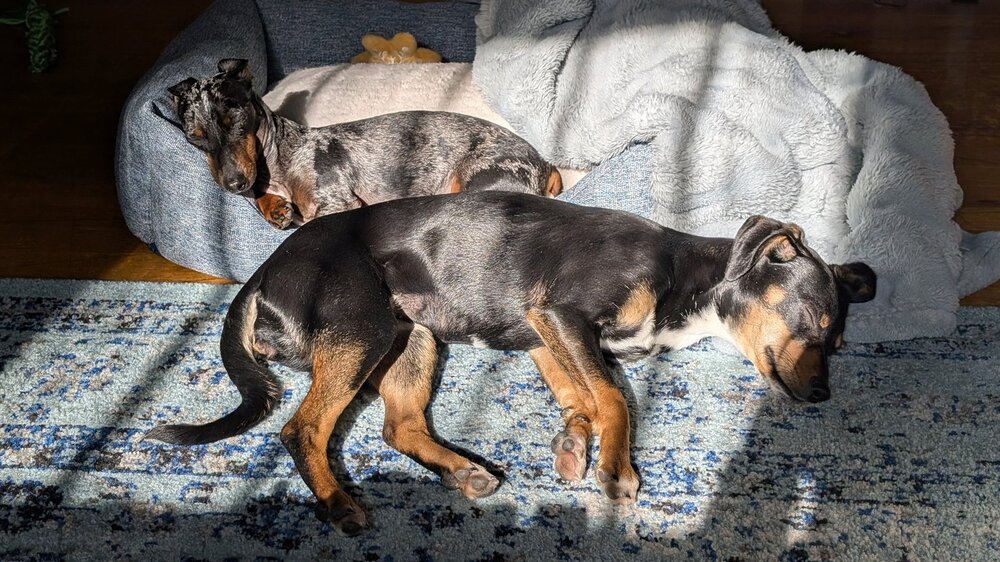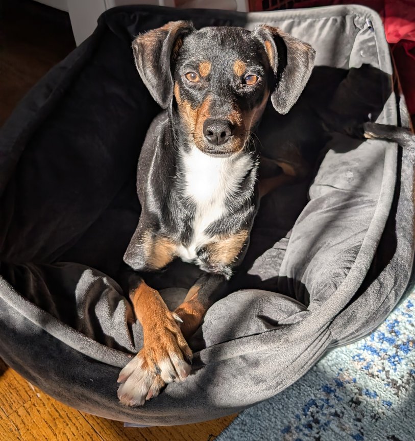 Energy level: Medium. She loves to run around and play. She plays with toys by herself, loves to hoard them, and must be supervised because she tries to eat them! She is also good at napping in the sun or in her bed.