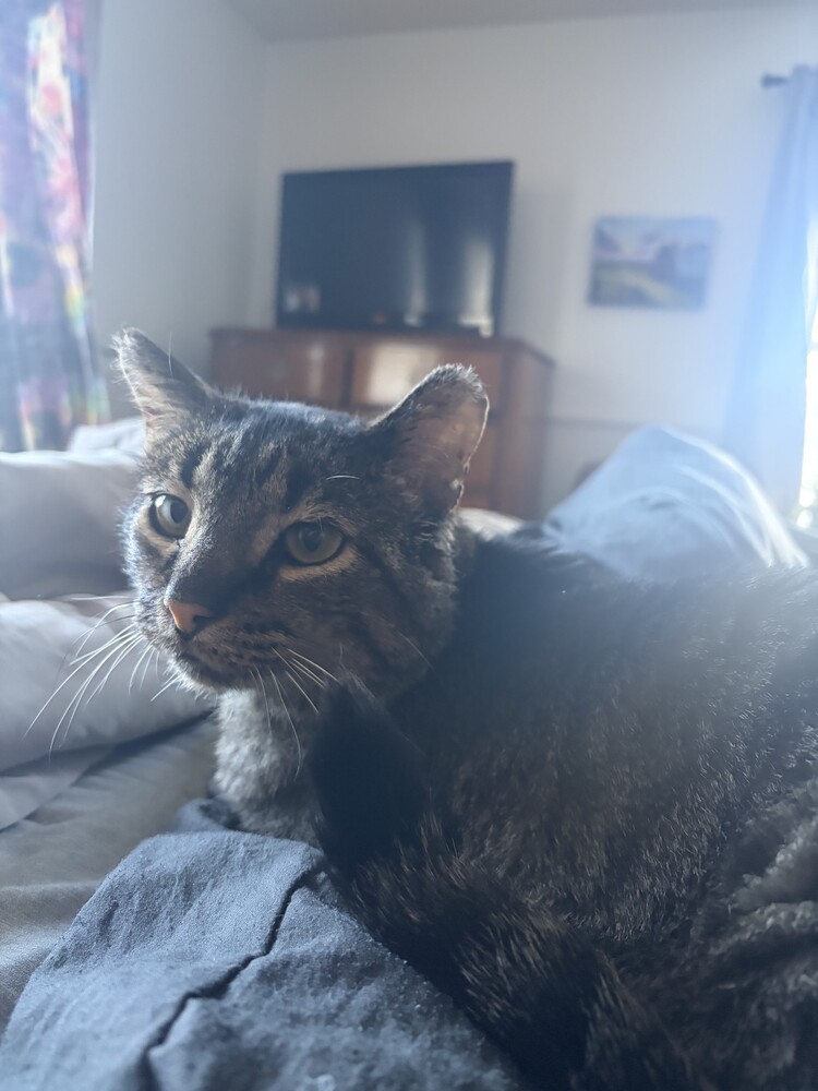 Energy level: Low. He likes to cuddle with people or soft toys. He loves to look out the window and sit in his cat tree boxes.